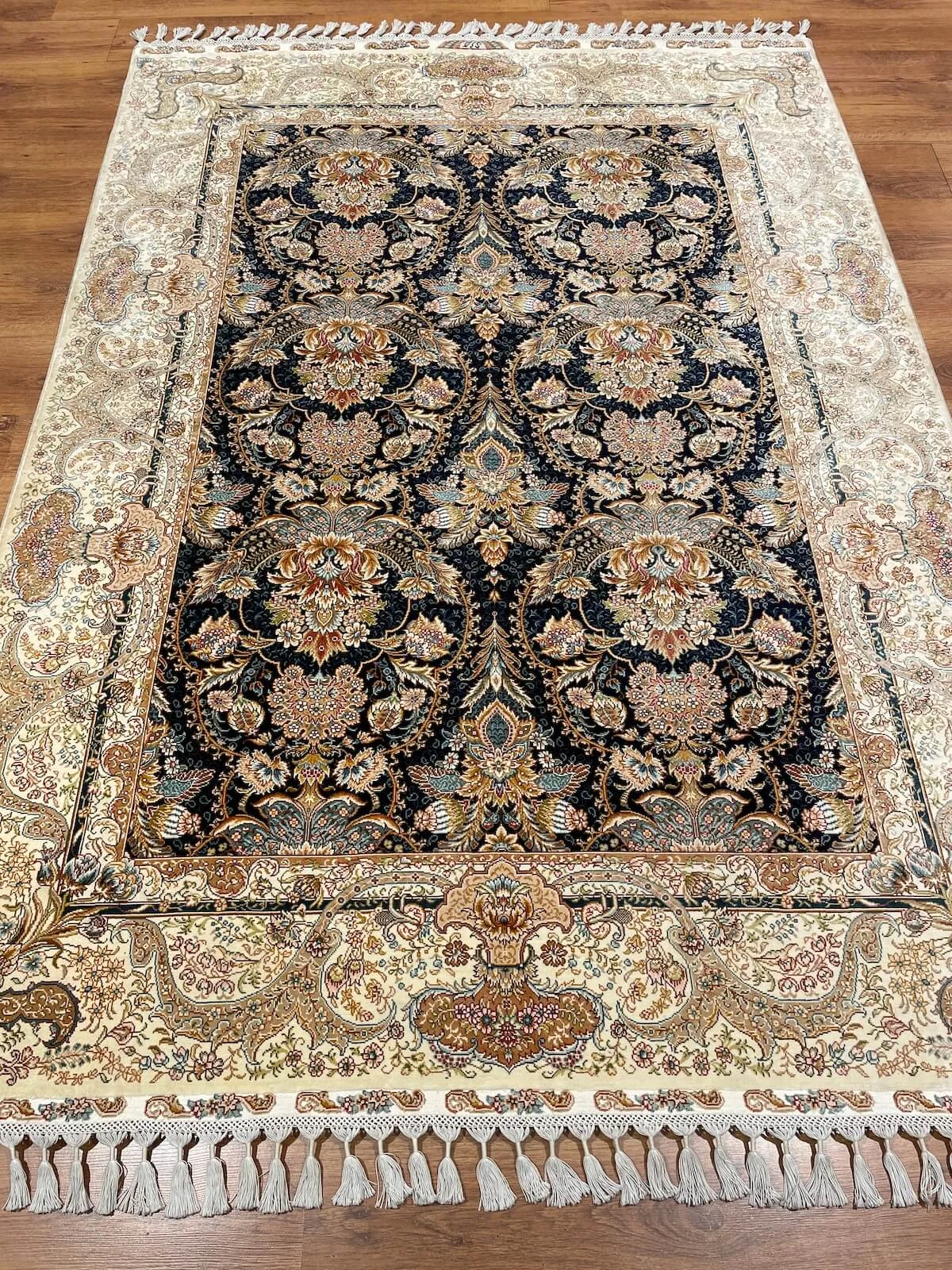 İpek el dokuması halı. İnce işçilik ve parlak görünüm ile prestijli mekan dekoru.